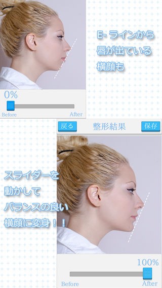 「横顔E-ライン整形」は、横顔にポイントを絞って整形シミュレーションできる美容アプリです。このアプリは、写真の選択・写真位置の調整・顎ラインの調整をするだけ!整形結果は、スライダーで角度を調整することもできるので、自分に合った黄金ラインをチェックすることができるでしょう。写真はその場で横顔を使用することもできますが、カメラロールの横顔写真も使用可能!横顔写真を上手く撮影できない場合は、事前に友達に撮影してもらってみてはいかがでしょうか。