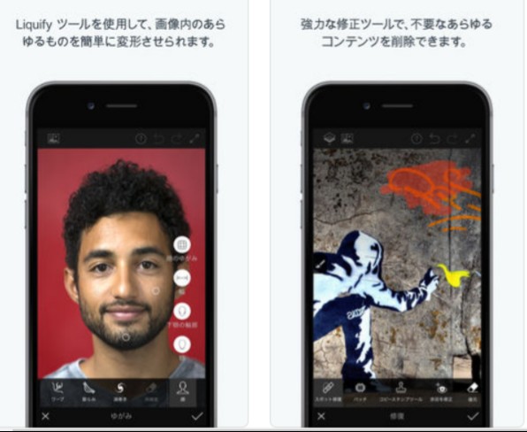 「Adobe Photoshop Fix 」というアプリは、画像の中に写り込んでいる不要な通行人などを、指でなぞるだけで消すことができ、ナンバープレートのナンバーをさっと消すのにも応用できます。さらに、被写体の一部だけにシャドーやカラーを入れたり、変形させたりもできる優秀アプリです。車を歪ませて事故車のように見せるなどの特殊な加工もできるでしょう。