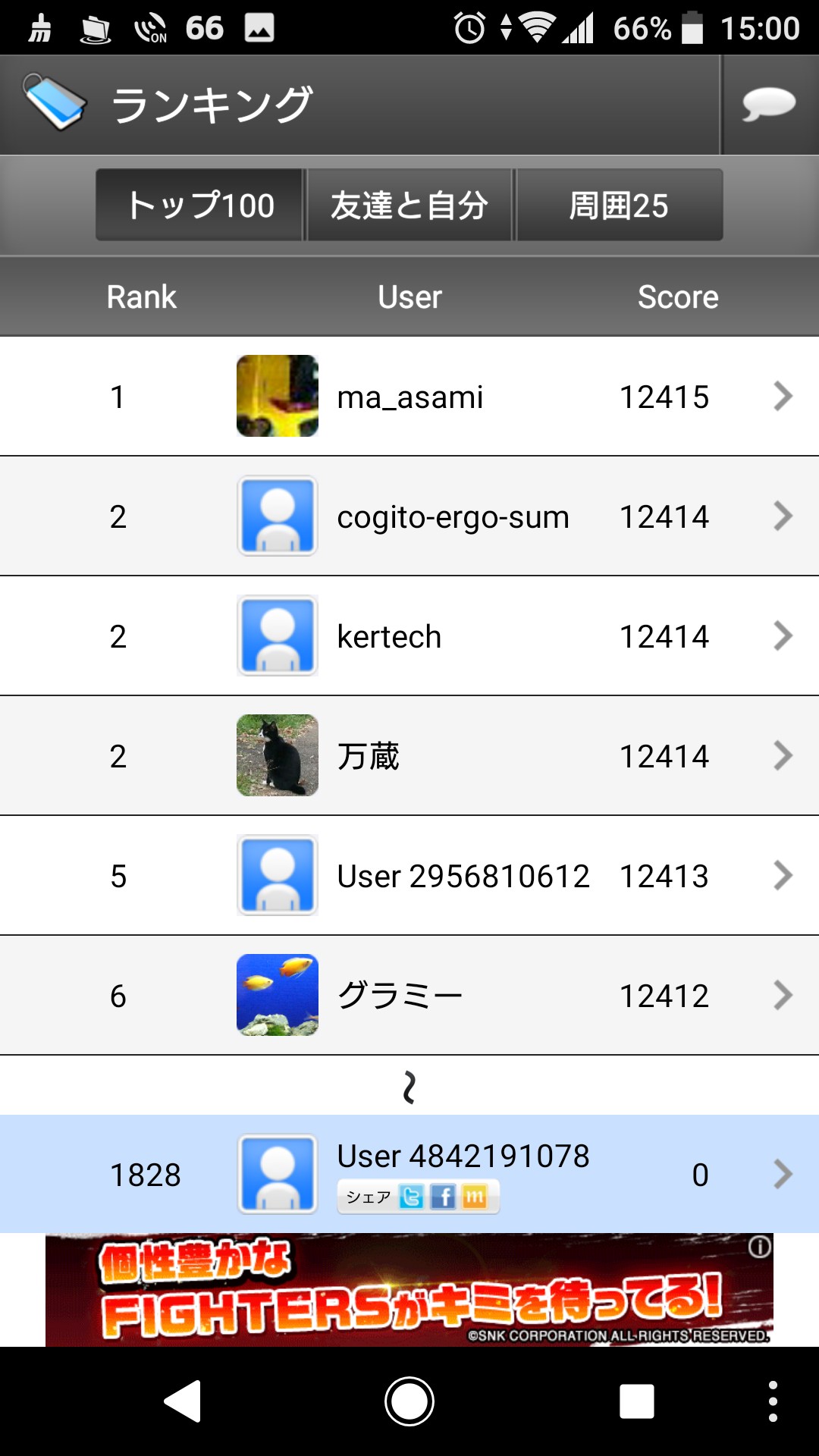 また、「ランキング」では全ユーザーのトップ100、友達と自分、全ユーザーの中での自分の前後25人の順位を確認することができます。