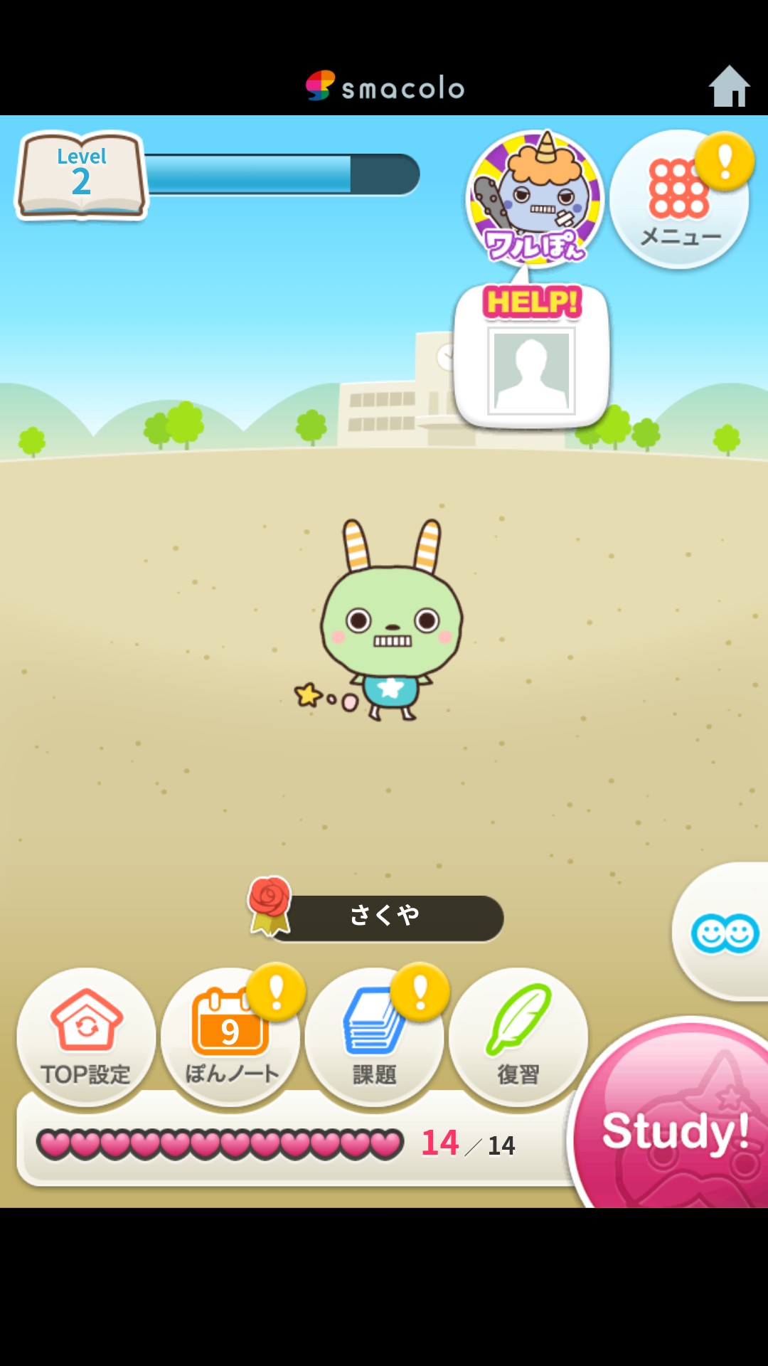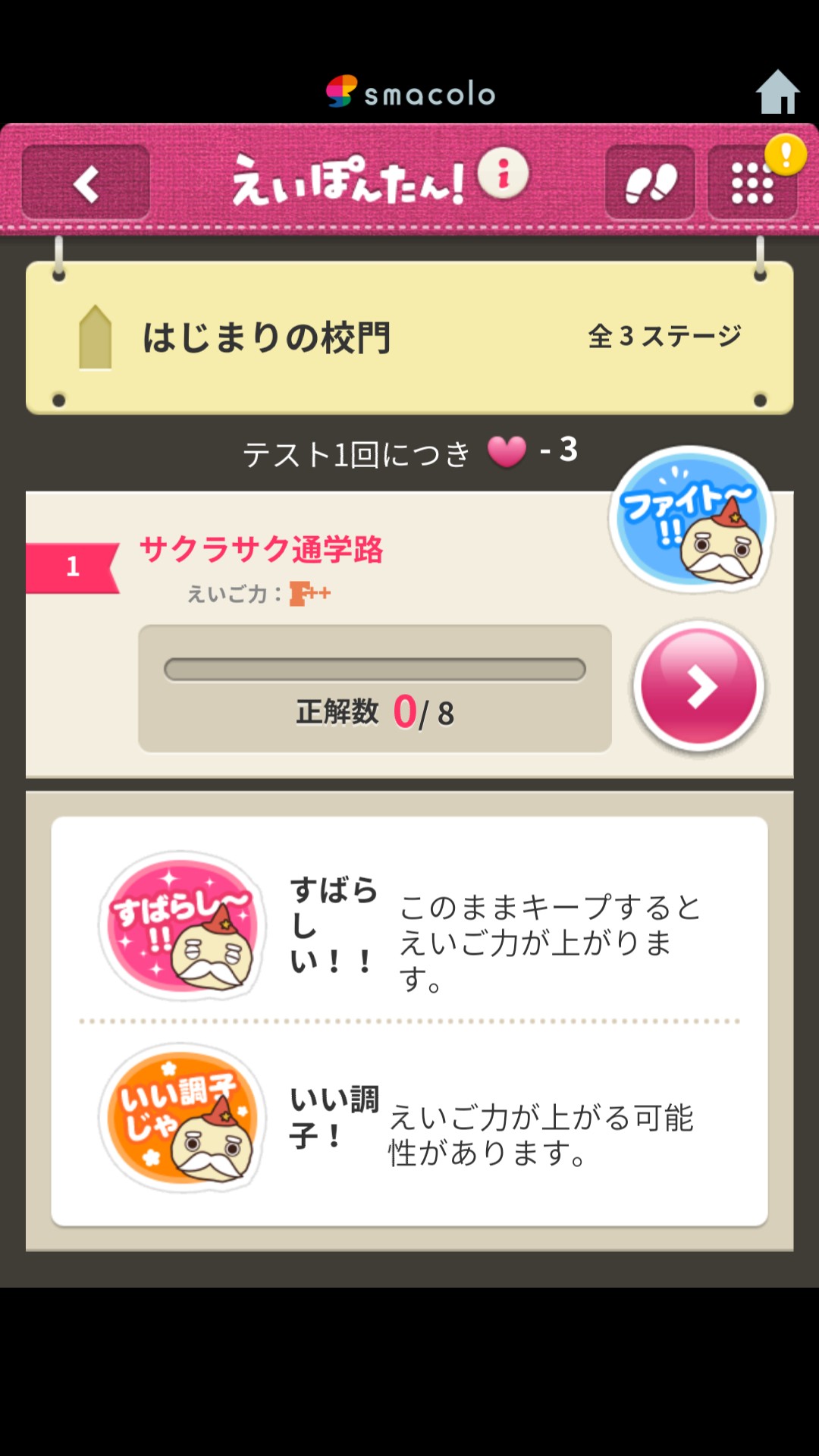 学校で自分が選んだ生徒キャラの先生になって英語を教えるという設定で学習します。最初に出題される5問の単語テストでレベル分けされ、自分のレベルに応じた問題が出題されるようになっています。