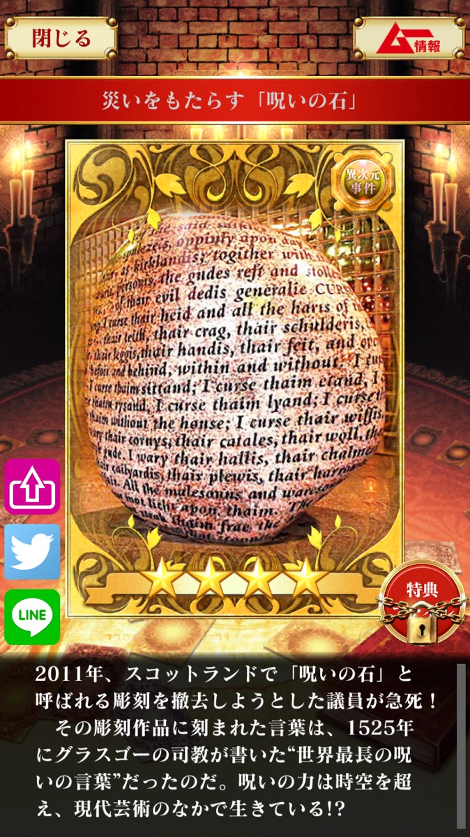 都市伝説やオカルトが好きな人におすすめしたいアプリが「超都市伝説ガチャ」。有名オカルト雑誌「ムー」のアプリ版です。1979年に創刊した「ムー」により集められた都市伝説の中で、厳選した記事だけをピックアップしてガチャブックに仕上げました。アプリをスタートすると怪しげな水晶が現れるのでスライドして回してみてください。1枚カードが開放され、「ムー」の編集部がピックアップした秘蔵都市伝説が確認できます。ゲットしたカードからはGoogle mapsに移動でき、ストリートビューを利用して仮想都市伝説ツアーも体験できますよ。用意されたカードは全150種類。コンプリートしたくなりますね。