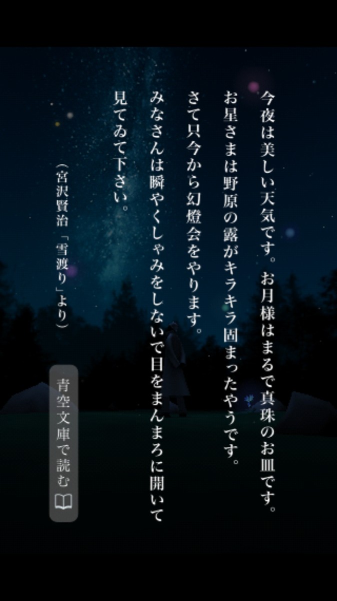 ロマンチックなアプリ、「星めぐりの夜」は感性を磨きたい気分の日におすすめ。幻想的な画面に現れる星をタップすると、宮沢賢治が書いた小説の一節が表示されます。バックグラウンドには宮沢賢治の「星めぐりの歌」をモチーフにした音楽が流れ、癒しの空間を演出。アプリを開くだけで、宮沢賢治の世界観にどっぷりと入り込めるアプリです。気になる一節と出会えたら、「青空文庫」で全編読んでみることをおすすめします。
