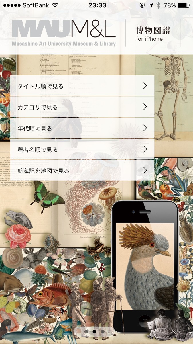 武蔵野美術大学の美術館・図書館による公式アプリ、「MAU M&L 博物図譜」。館内に保存されている貴重な資料の画像を解説とともに閲覧できるアプリです。第17回文化庁メディア芸術祭審査委員会推薦作品にも選ばれるほどの完成度で、美大生や絵画愛好家だけでなく、感受性豊かなサブカルファンにも注目されています。アプリならではの機能を駆使して、紙の状態ではできなかった書物の楽しみ方も新たに提案。スマホのスクロールや拡大機能もそのまま利用できるので、貴重な資料を細部まで楽しめます。