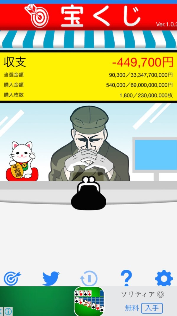 「億の細道」は宝くじを購入した場合、どのくらい儲けることができるのか、当たる確率はどのくらいか、を疑似体験することができるアプリです。夢の1等当選を目指し、宝くじを購入したつもりになって楽しくシミュレーションできる点が大きな魅力。当選確率や金額、支払いの総額、販売枚数などは、2015年のサマージャンボ宝くじのデータを元に算定しており、よりリアルな体験をすることができます。使い方は簡単。画面中央のお財布アイコンをタップすることで、宝くじを購入し、当たるまでそれを繰り返すだけです。なかなか当たらず、つぎ込んだ総額に心が折れそうになることもありますが、現実を受け止めてください。一方、強運ですぐに当選する可能性もあります。家族や友達同士で楽しむのもおすすめ。当選したら、ツイッターで報告して皆に自慢しましょう。