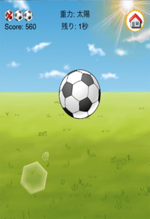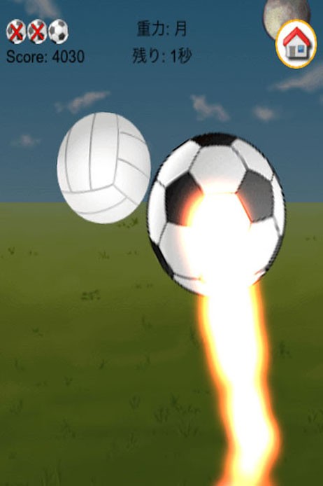 他にもまだあります。太陽の重力→こちらは今度は月と正反対、つまり重力が上がって、ボールは落下する速度があがるので、リフトに集中して切り抜けてください。また、スクリーンショットでもあるように、サッカーゲームなのに突然、どこかからバレーボールが混入してきます。当然バレーボールにリフティングを妨害されるので混乱必至ですね。このように、様々な得点を稼げるアイテムと、逆に失敗しそうになるアイテムとが混在しているので瞬間ごとに見定めながらやることが難しさであり、面白さでもあります。3回リフティングに失敗するとゲームオーバーです。この「指先リフティング」は反射神経を養うのにいいかもしれません。