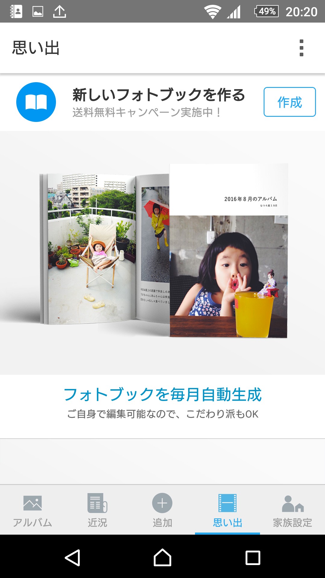 容量無制限で家族と写真を共有できるアプリが「家族アルバム みてね」です。おじいちゃん、おばあちゃんに孫の写真を送ってあげると喜ばれますが、このアプリを使えばわざわざ現物を送らなくても、みんなで画像を共有できます。アップした写真は自動で日付順に整理整頓され、ページをめくるごとに1か月前の写真がでてくるという機能も搭載されています。毎月自動でフォトブックを作成してくれるので、自分で写真を選ぶ手間なくアルバムが作れてしまいます。招待した家族しか閲覧できないのでプライバシー面も安心です。