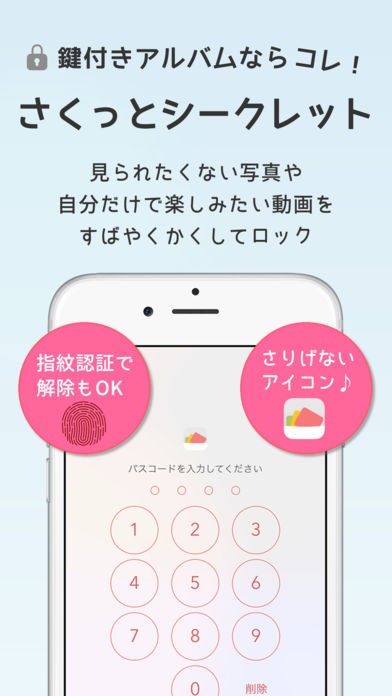 画像出典:https://itunes.apple.com/jp/app/%E8%A6%8B%E3%82%89%E3%82%8C%E3%81%9F%E3%81%8F%E3%81%AA%E3%81%84%E5%86%99%E7%9C%9F%E3%82%84%E5%8B%95%E7%94%BB%E3%82%92%E9%9A%A0%E3%81%99%E9%8D%B5%E4%BB%98%E3%81%8D%E3%82%A2%E3%83%AB%E3%83%90%E3%83%A0-%E3%81%95%E3%81%8F%E3%81%A3%E3%81%A8%E3%82%B7%E3%83%BC%E3%82%AF%E3%83%AC%E3%83%83%E3%83%88/id945569194