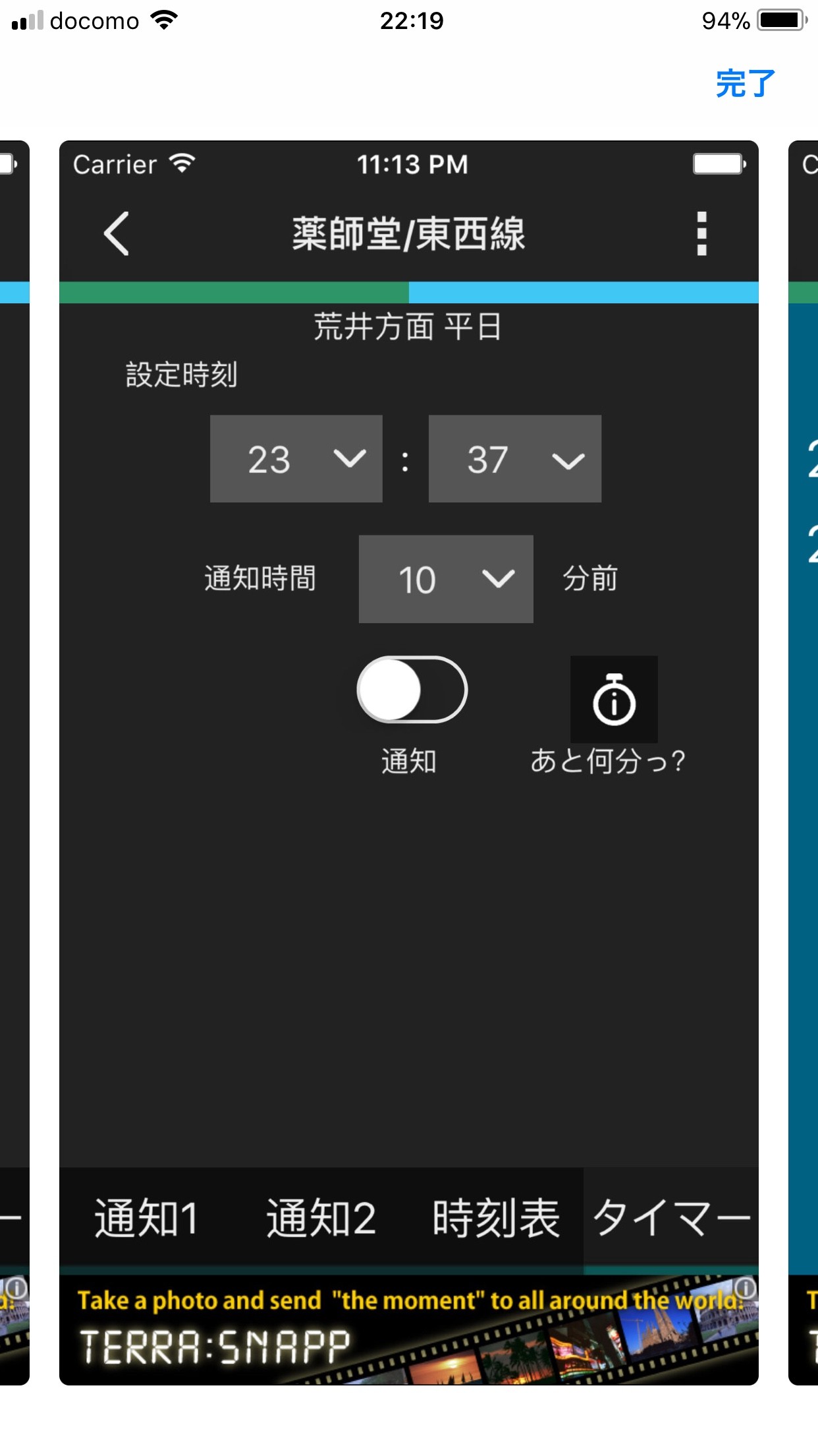 例えば、こんな場面ありませんか?少し買い物をしてから地下鉄に乗りたいけど、待ち時間は嫌だからベストなタイミングに乗りたい時など、こんな時にこのアプリの威力が発揮されます。次の電車が来る時間を通知してくれる機能が目玉で、10分前から60分前まで設定することができ、お好みの時間設定ができますので、自分の乗りたいダイアの電車に合わせて通知してくれます。