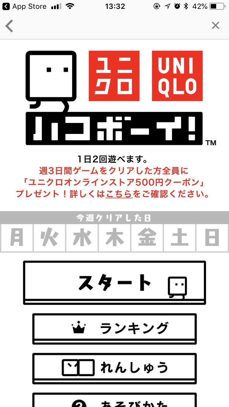 実はこのハコボーイを週に3日間ゲームをクリアした方全員に500円分のクーポンがプレゼントされます。ユニクロオンラインストア限定のクーポンとなりますので、ゲームも楽しめクーポンも手に入る、まさに一石二鳥なコンテンツとなっています。