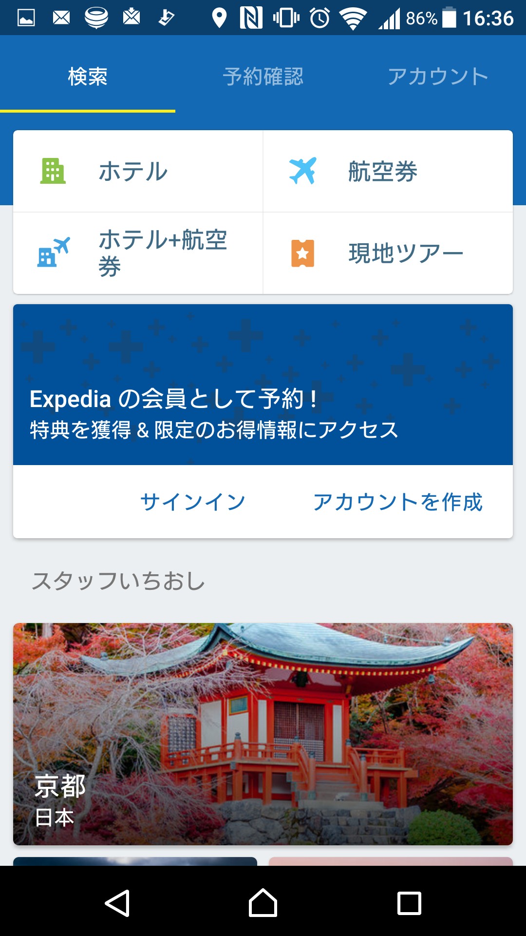 エクスペディアは、航空券・ホテル・現地でのツアーまでの一通りを検索して予約出来るアプリです。