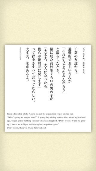 2011年に発生した東日本大震災。このアプリでは世界中から届いている被災者を応援するメッセージや写真をはじめ、避難所で過ごす人や救助に取り組んだ自衛隊員の家族の言葉などを読むことができます。メディアでは取り上げられないような被災者やそれに関わる人々の日常のリアルな声が心に響きます。アプリは10か国以上の言語に対応。世界中の人が利用可能です。記事はiPhoneの画面用に読みやすく表示されているユニバーサルデザインを採用。画面上をピンチアウトすることで文字を拡大したり、心に残った記事をブックマークしたり、と便利な機能が備わっています。アプリの特典ブック「読者の声」では、記事を読んだ人の、自筆の感想やメッセージの閲覧が可能。その文字一つひとつに込められた思いに感動させられます。個人で楽しむのはもちろん、お子さんや生徒さんに震災を伝えるためのツールとして読み聞かせてあげるのもおすすめです。