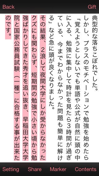 成績が上がらないと悩んでいる人におすすめな「非道徳な勉強方法」。このアプリでは今までの勉強法は何だったのだろうと思ってしまうような、一般の参考書にはないユニークな勉強法が紹介されています。アプリの著者は2浪して夜間大学に入った苦労人。あるとき普段の勉強方法が間違っていたことに気づきます。その後、オリジナルの勉強法を駆使し有名大学の大学院や国家公務員試験にも合格。このアプリを読めばそんな著者の脳科学と心理学に基づいたオリジナルの勉強法を知ることができます。読みやすい機能も充実。なかでも読むスピードに合わせたオートスクロール機能は、iPhoneを操作することなく読み進めることができとても便利です。気に入った記事をツイッターなどのSNSで友人や家族と共有することもできます。