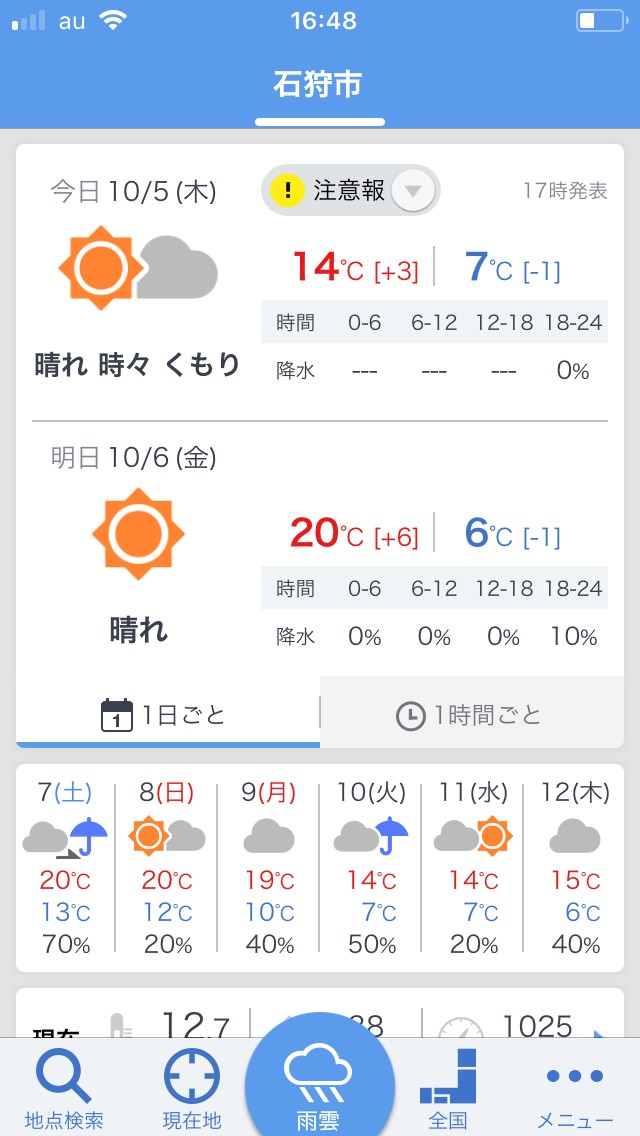 1時間ごとの天気がわかるので、アウトドアでの活動も計画しやすくなります。