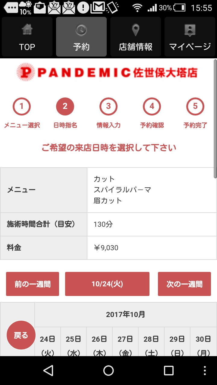 店舗検索では、佐世保店のみが載っているので実際には検索ではありませんが、お店の名前をタッチすると、佐世保店アプリのトップページメニューが赤色ボタンでズラリと現れます。一番上が「予約」です。その名のとおり、パンデミック美容室の予約が出来ます。予約ボタンを押してもクーポンボタンを押しても同じページに飛び、パンデミック美容室の予約が出来るようになっています。技術メニューや、クーポン、個々の料金と合計料金、所要時間まで出てきます。