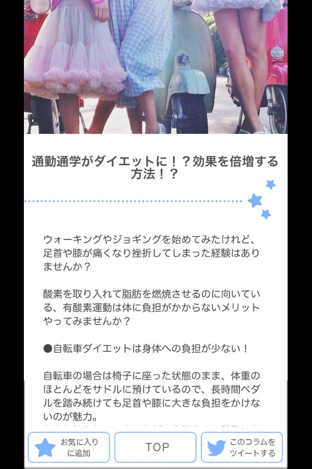 ダイエットコラムが載っているこちらのアプリは、ストレッチを続けるモチベーションを高めるのに役立ちます。おもしろいと思えたコラムは簡単にお気に入り登録できるので、自分だけが使えるリストを作成できるでしょう。1日のちょっとした時間を使うだけで、ダイエットの成功が近づきますね。