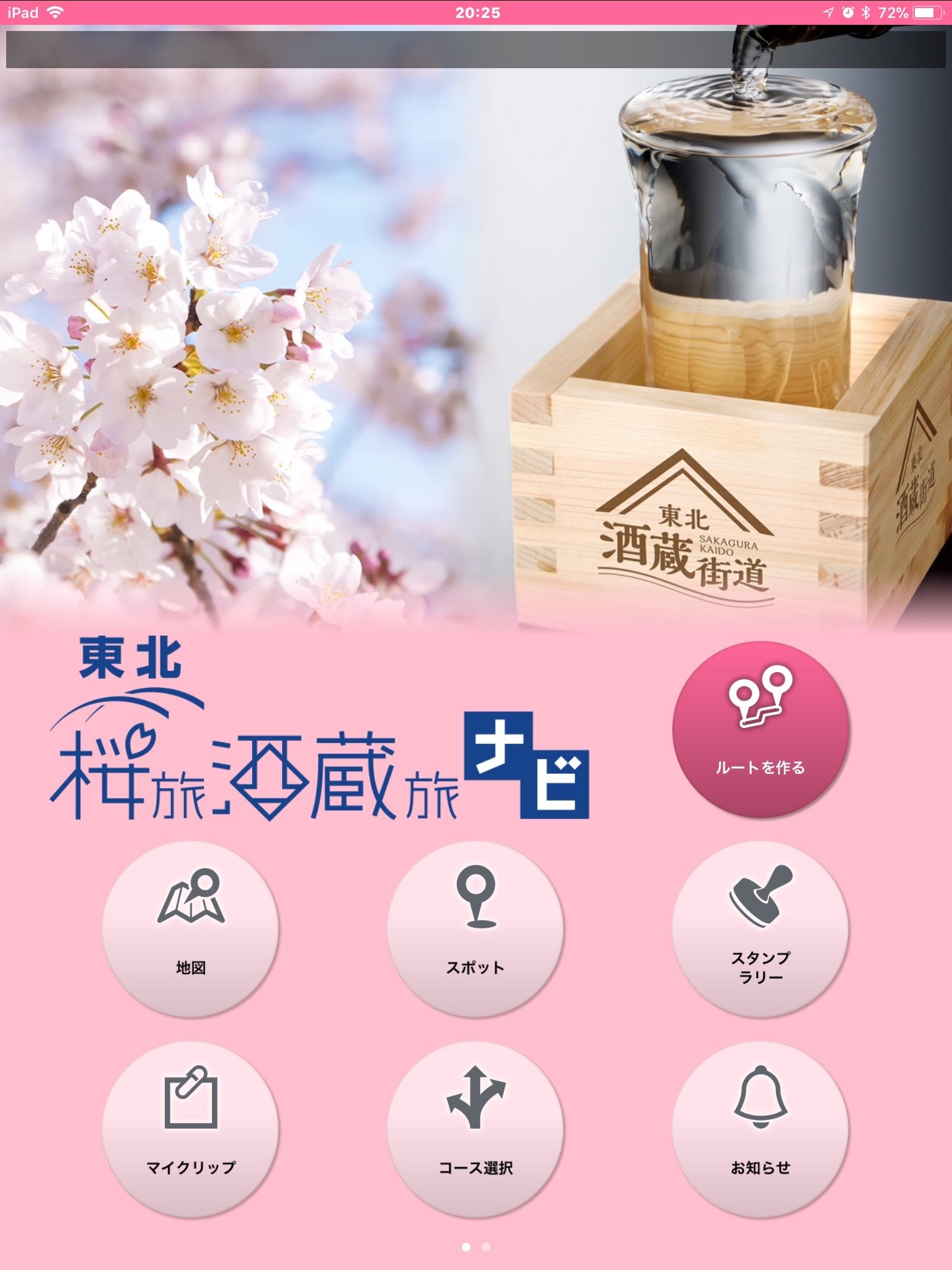 東北の桜、そして酒蔵を旅するアプリです。おすすめのルートを「おちょこパス」というネーミングで紹介しています。