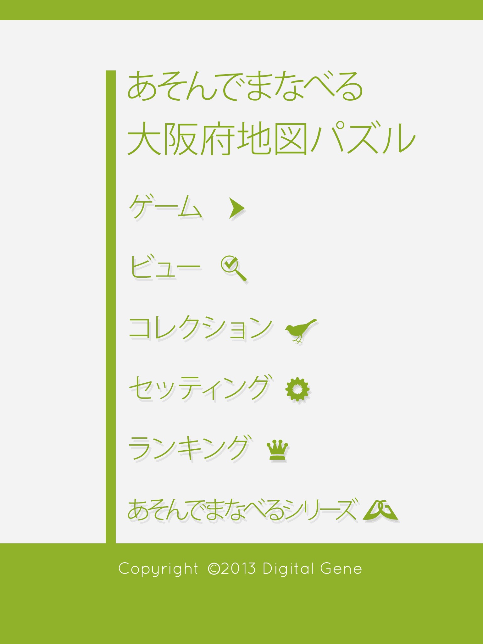 ジグソーパズル感覚で、大阪市の市町村の地名を覚える、教育系ゲームです。レベルにあわせて、境界線や地名の表示が異なる、3つのモードで利用できます。アシスト機能でプレーヤーをサポートし、全世界でタイムランキングが表示されるので、楽しみながら、知識を上げていけます。