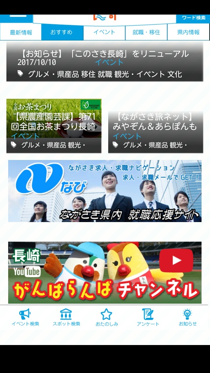 長崎県の旬な情報を提供する「このさき長崎」は、長崎で行われるイベントや出来事を案内するとともに、就職情報や県内への移住希望者に対する情報提供、県内の地域おこしの情報なども提供し、自治体としての地域活性化の動きを知らせます。また、身近な長崎関係のお店・施設を地図で表示し、長崎県にちなんだクイズ、コンテンツを楽しむことができます。