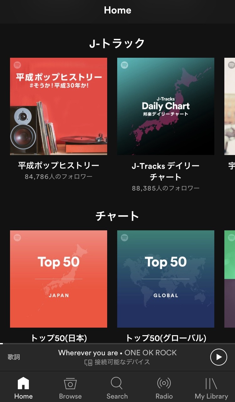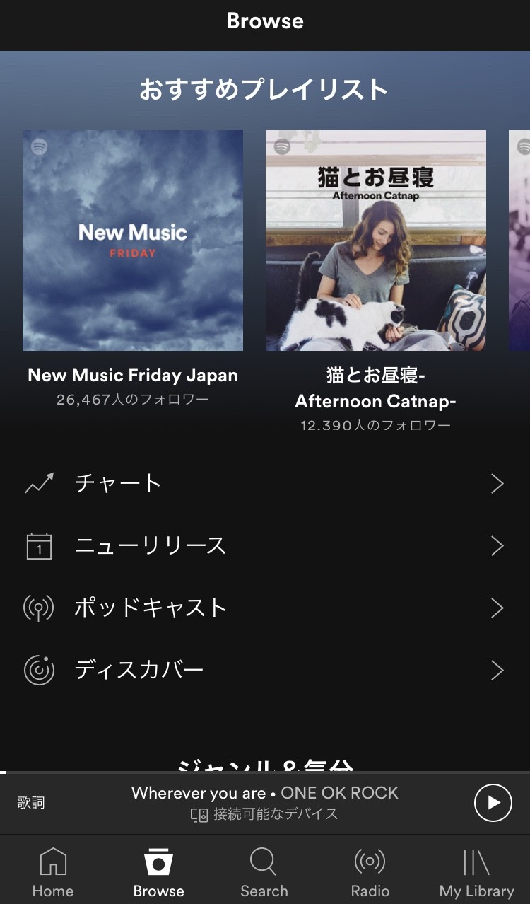 プレイリストの数は20億以上で、ジャンルや気分、アーティスト別にプレイリストが用意されています。オリジナルプレイリストも簡単に作ることができます。