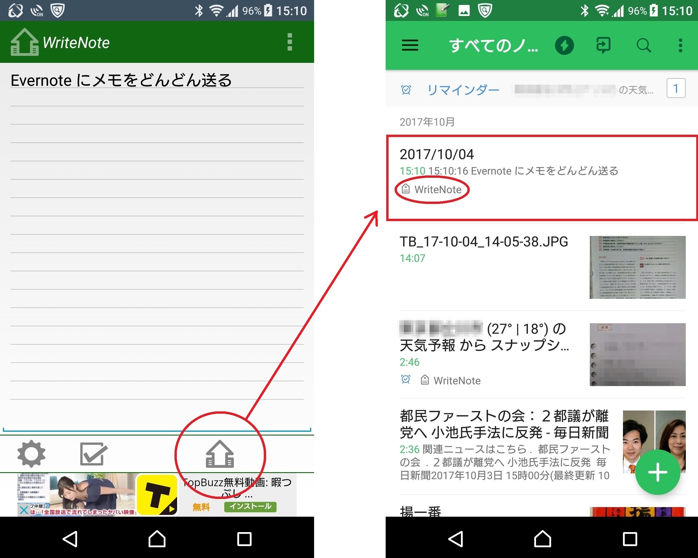 Evernote側にも自動的に同じ名前のノートブックができ、メモはそこに送られます。