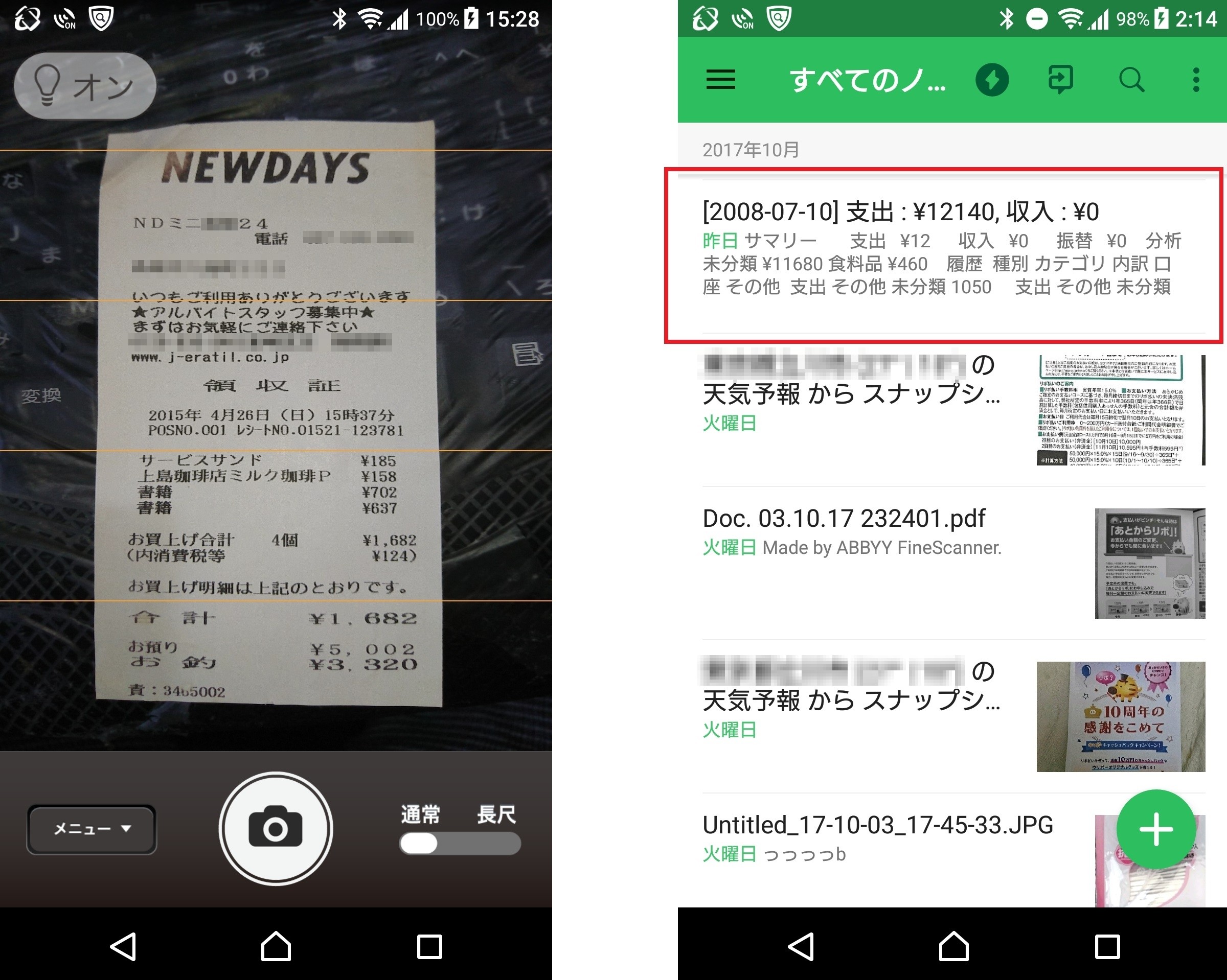 このアプリで撮ったレシート内容が“毎日”Evernoteに送られます。