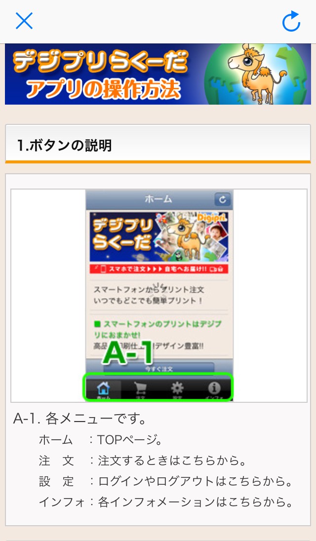 こちらのデジプリらくーだは、アプリ内にしっかりとマニュアルが用意されています。