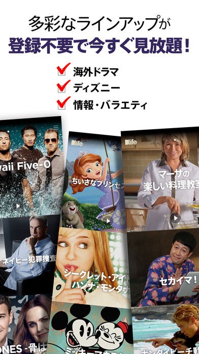 アプリでは、テレビ放送を見逃してしまった番組を、放送直後から配信する見逃し配信の視聴が可能です。テレビと同様、字幕、吹き替えどちらにも対応しており、自分好みのスタイルで視聴することができます。アプリ内すべての番組を会員登録不要で無料視聴することができます。