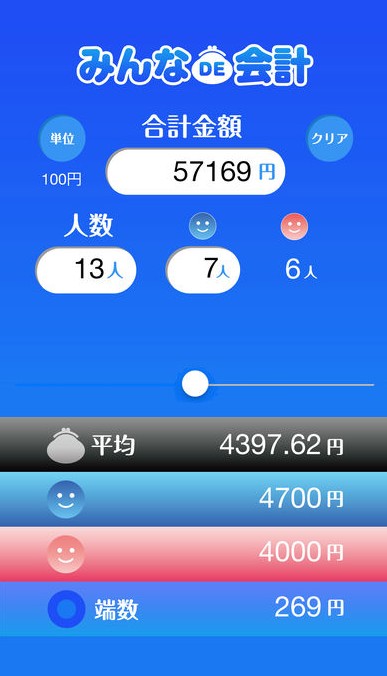 基本的な割り勘とともに、女性や後輩といった立場の違う人を安めに設定できる上に、ルーレットゲームの遊び機能も搭載してるのが魅力!「幹事無料」や「女子は安めに」といったルーレット結果から、新たな割り勘結果を出すこともできるので、立場の同じ仲間内で利用すると面白いアプリです。
