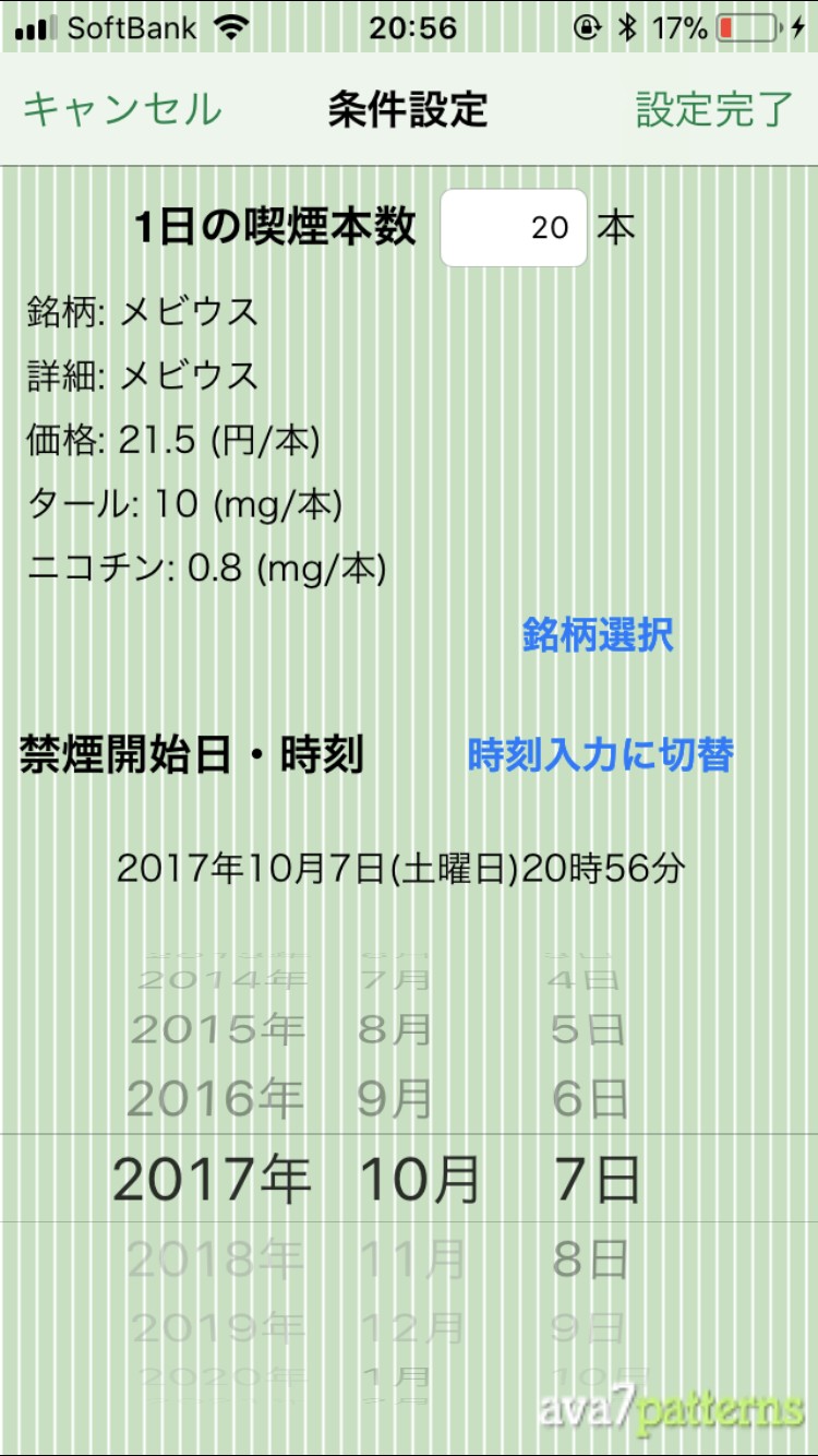 喫煙スタート日、禁煙スタート日、一日の喫煙量、平均喫煙時間、タバコの価格を設定すると、