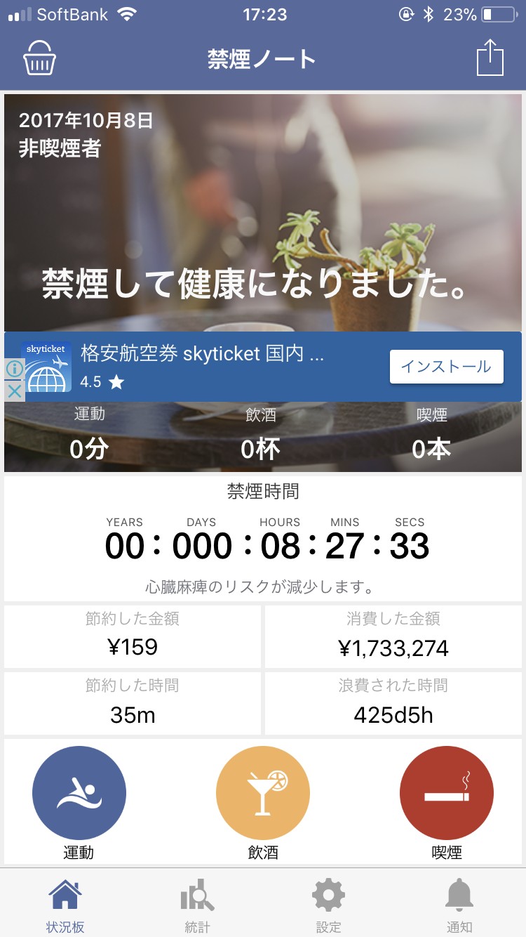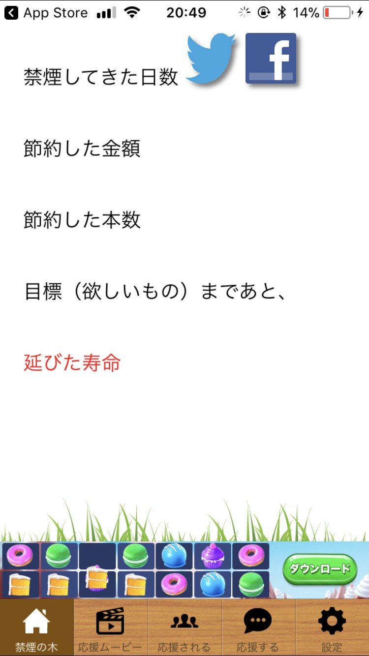 節約した金額や本数、禁煙によって延びた寿命が表示されます。