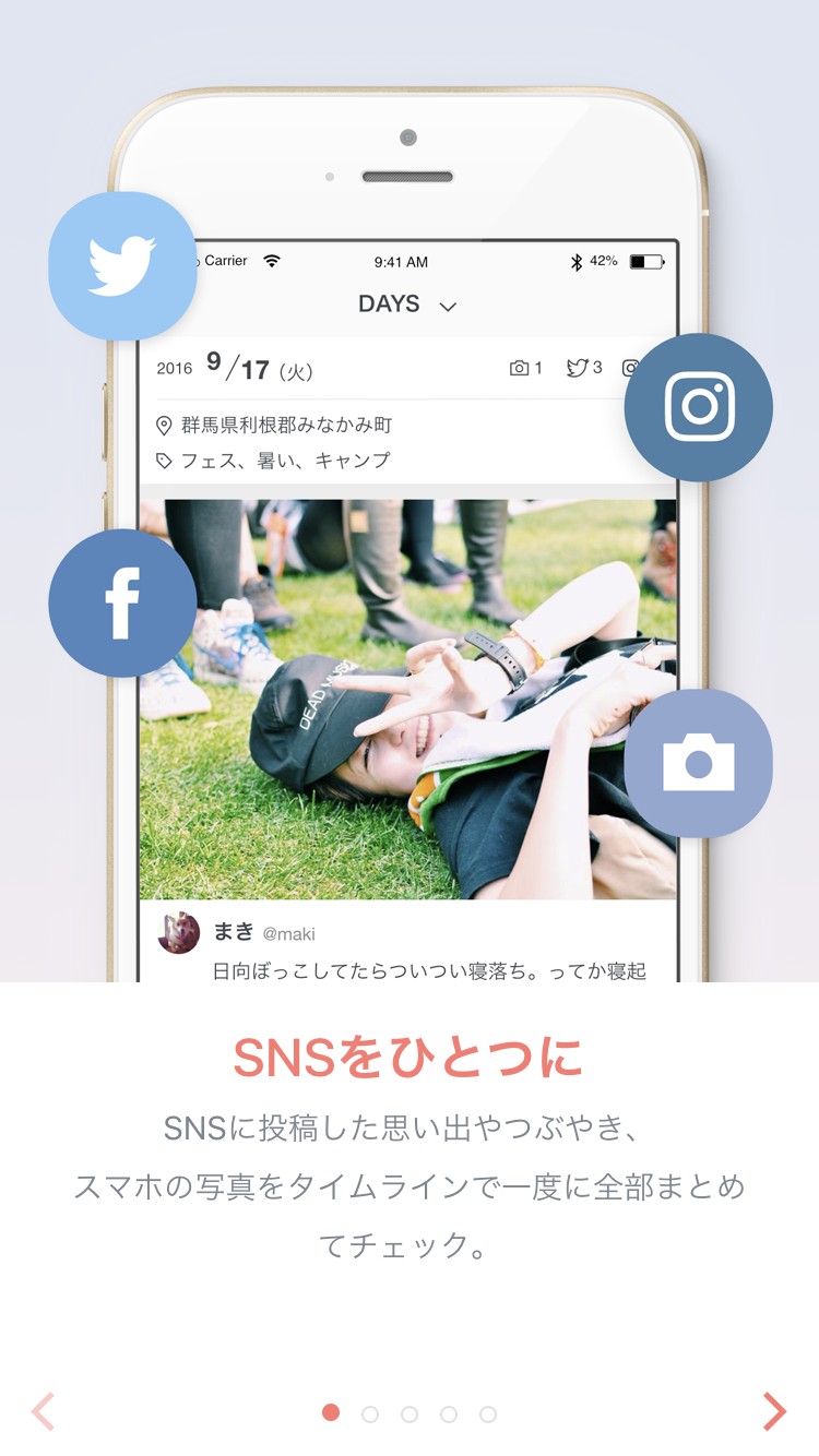 その中から出来事や写真をまとめるだけで簡単に記録出来てしまう、便利な日記アプリです。