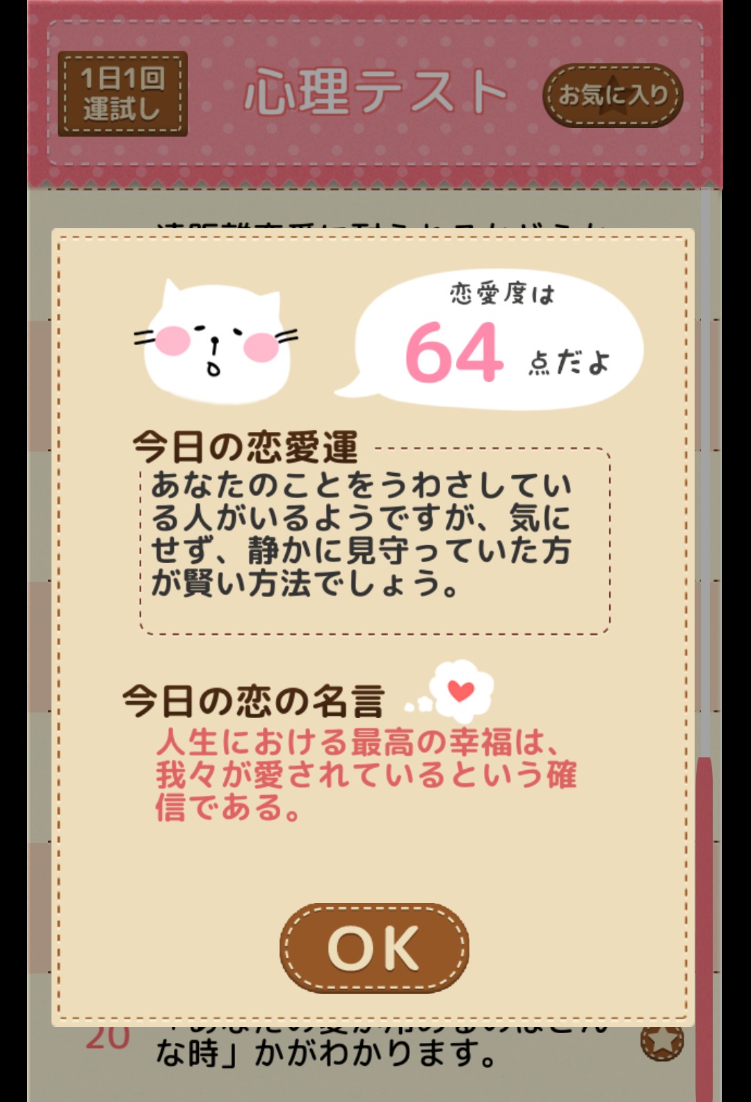 「あなたは一途タイプ?浮気タイプ?」「あなたが恋人に求める第一条件は?」など、自分でも気付けなかった恋愛観を心理テストで診断出来ます。心理テストの他に、毎日占える1日1回の運試しや恋の名言などの内容は、恋する女子にとっても強い味方になる事間違いなしです。ゆるいビジュアルのネコキャラにほっこり癒やされながら恋愛診断を楽しみませんか?