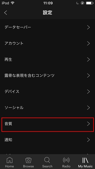 すると設定メニューが出てくるので、その中の音質という文字をタップしましょう。
