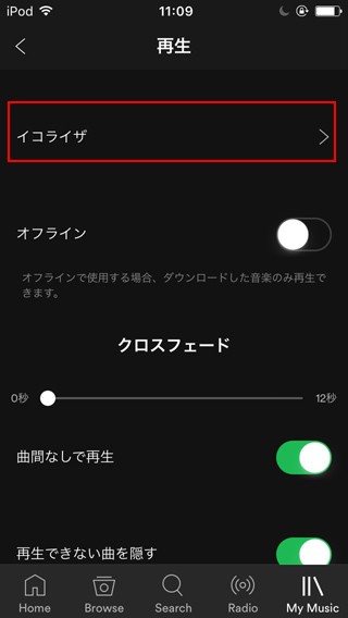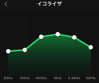 初期設定ではイコライザ機能はオフになっています。イコライザと書いてあるスライドスイッチをタップして、オンにしましょう。