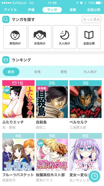 株式会社白泉社よりリリースされている総合エンタメアプリです。マンガは過去の懐かしい作品から今現在連載中のものまで、約150作品以上が揃っています。「花とゆめ」「メロディ」「ヤングアニマル」など白泉社の全雑誌の連載作品も取り扱っており、そのすべてを無料で(制限あり)読むことができます。特徴的なのは、少女漫画といわれる女性向け有名作品が充実している点です。検索機能も、「男性向け」「女性向け」など選びやすく、マンガアプリ初心者でも使いやすくなっています。
