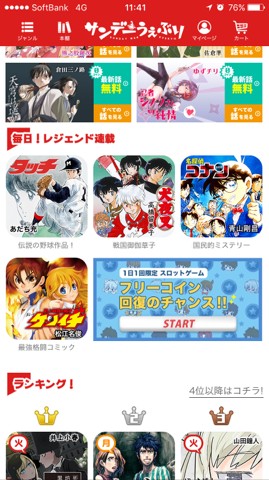 小学館の「少年サンデー」「ゲッサン」「サンデーGX」に連載されている作品を読むことができるアプリです。そのラインナップは「タッチ」や「名探偵コナン」などの代表作をはじめ、過去の連載作品から話題の最新作まで。数万話にのぼる作品を毎日無料でもらえるポイントを使って読むことができます。さらにポイントを使えば使うほどレベルがアップし、ポイントの限度が増加します。つまり読めば読むほどお得に利用できるマンガアプリなのです。