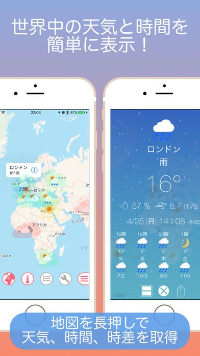 表示される地図の上を選択するだけで世界中の天気が表示されます。天気だけでなく、時間や時差もわかるのが特徴。天候が変わったら、通知があるので、天気の変更通知を3D Touchで強く押します。そうすると情報が美しいアニメーションで出てきます。3D Touchに対応していない場合は、通知をスライド後、表示ボタンで確認可能です。3時間ごとの天気、気温を表示。また1週間の天気、最高気温、最低気温の表示をします。分かりやすいウィジェトも特徴。