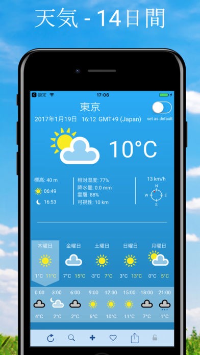 世界中の都市の天気予報と現地の時間が分かります。すっきりと整えられた画面が特徴でです。天気は14日分分かります。本日の最高、最低気温、相対湿度、降水量、雲層、可視性などが分かります。また、2時間おきの天気、気温も知ることができます。衛星地図で雲、雨、雲+雨の動きが分かるのが新鮮。
