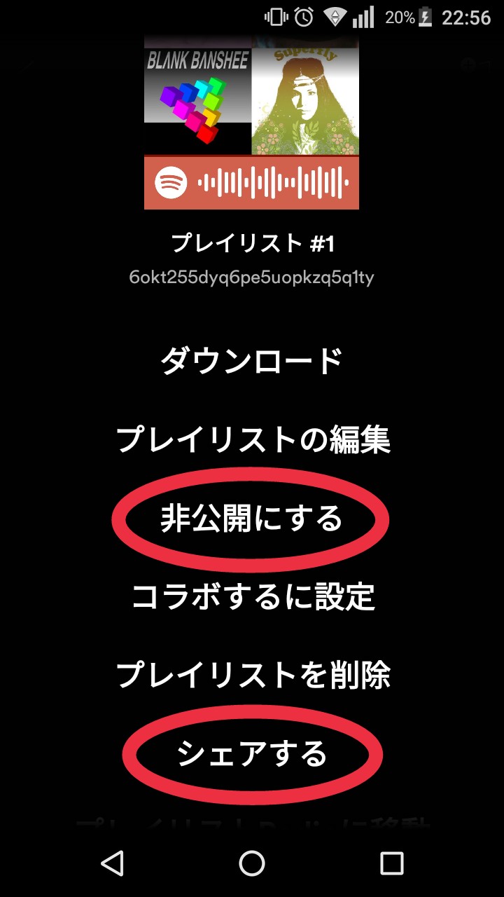 また、SNSなどでシェアしたいときは、同じく右上の「…」から「シェアする」を押すことで、SNSなどにオリジナルのプレイリストを投稿することができます。