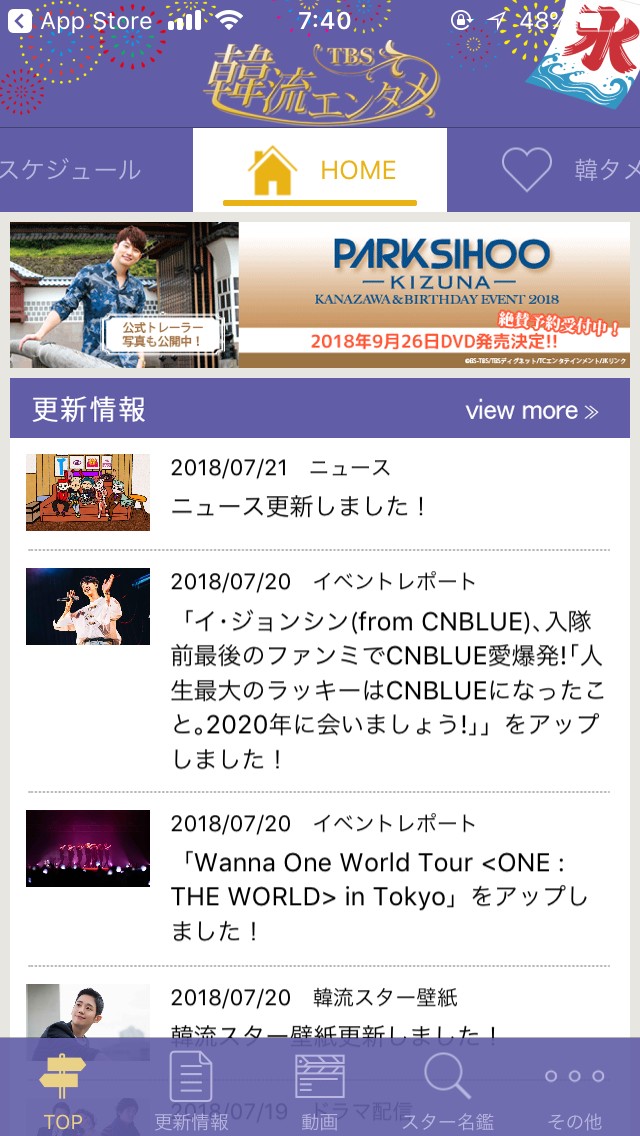 韓流アーティストのライブ情報、CDの発売などの更新情報、アプリ限定の特別インタビューなどが紹介されています。