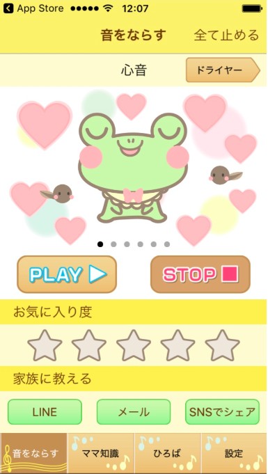 ワンタッチで赤ちゃんに安心感を与えるサウンドを再生できる、シンプルで扱いやすいアプリ『赤ちゃん泣き止み音アプリ-Baby's smile-』。ドライヤー音や掃除機音など15種類の音が収録されています。