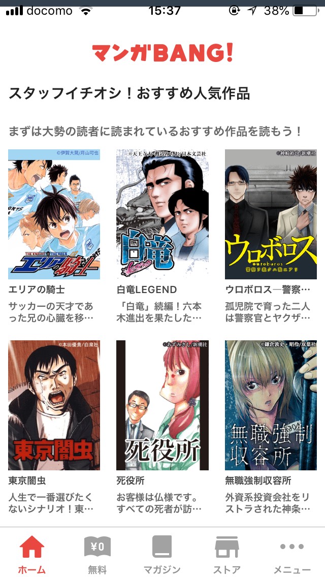 「マンガBANG!」は無料で読める方法が多い漫画アプリです。無料で読める方法は3種類あり、「1日1回30分読み放題」「フリーメダルを消費して読む」「期間限定の無料連載を読む」の3つです。フリーメダルは9時と21時の2回もらうことができます。また有料アイテムとして「コイン」を購入することもできます。コインを使って漫画を購入することができ、購入した漫画は無料の制限なくいつでも閲覧することができます。気に入った漫画があったら購入しておくのもいいでしょう。「ウロボロス」「死役所」などの有名な作品を読むことができます。1日30分読み放題なら結構な量を読むことができるので、1日にたくさん漫画を読みたいという人におすすめのアプリです。