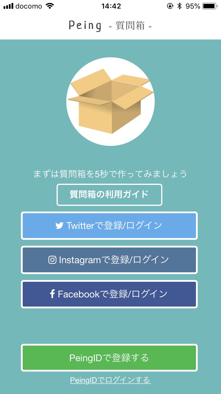 質問箱アプリの始め方は簡単です。まずアプリをインストールします。利用規約に同意し、ログイン画面に切り替わります。Twitter、Instagram、Facebook、PeingIDで登録できます。自分のよく使うSNSでよいでしょう。
