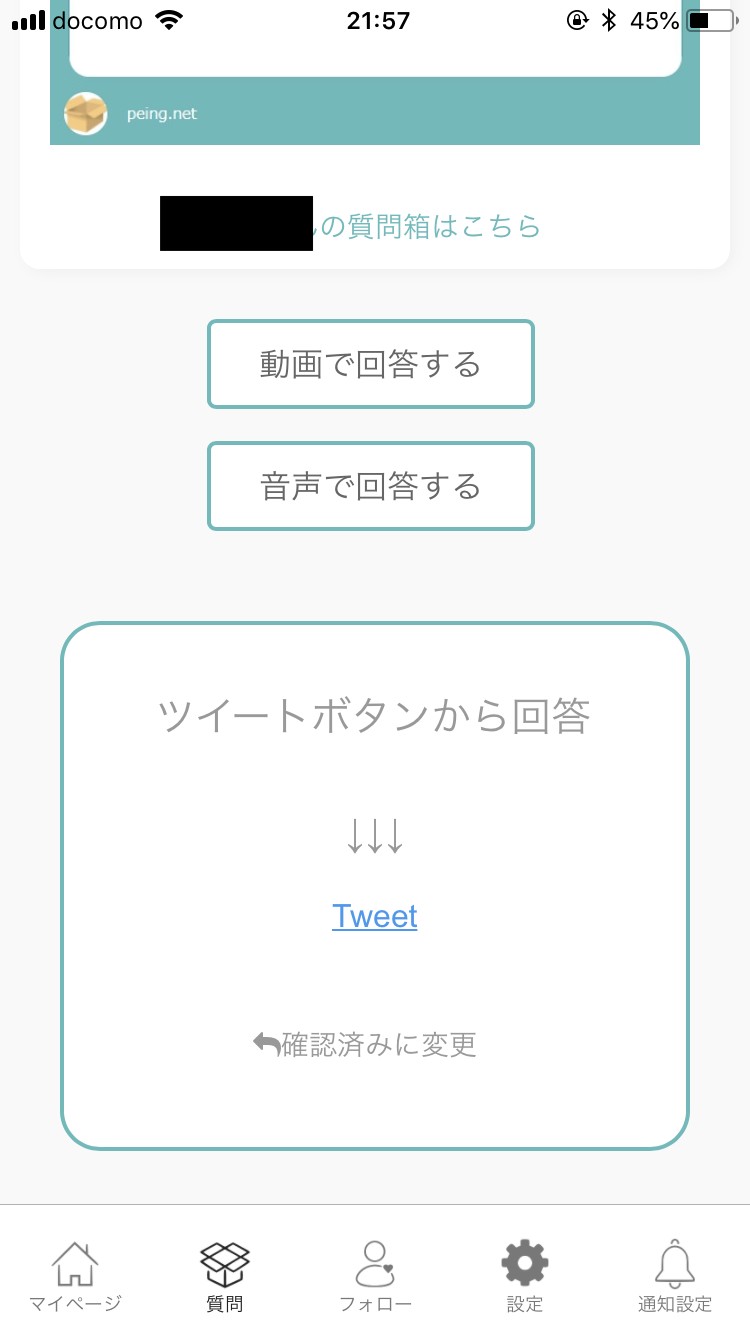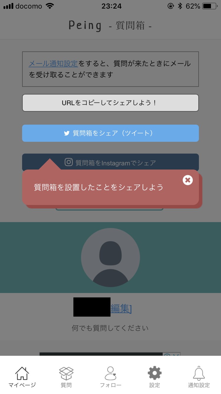 Twitterでログインするとすぐこのように「質問箱をシェア」という項目があるので、タップするとそのままTwitterにツイートできます。そのまま質問がくるまで待ちましょう。