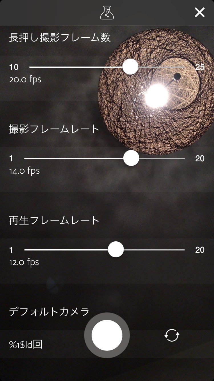 Boomerangの設定を変更するには、4本の指を同時に画面上で4回タップします。4回タップすると白字で設定のメニュー画面が出てきます。設定で調整できる内容は解像度、Boomerangモード、フレーム数、長押し撮影フレーム数、撮影フレームレート、再生フレームレートなどがあります。