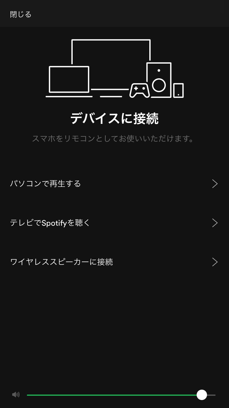 今WiFiなどに接続が完了しており、Spotifyとの接続が可能なデバイスの一覧が表示されるので、その中から選んで操作しましょう。