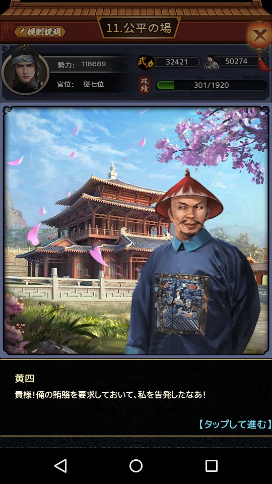 関所はメインストーリーとなるコンテンツで、主人公が清に潜む悪者を退治していく様子が描かれます。退治するといっても操作はタップだけなので難しくありません。昔のソシャゲ感覚でどんどん討伐しましょう。影響するのは武力と兵士です。兵士がなくなると敗北してやり直しになってしまいます。とはいえ失うものは兵士だけなのであまり気にする必要はないです。