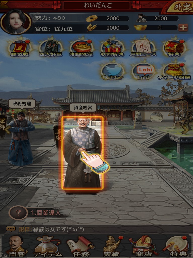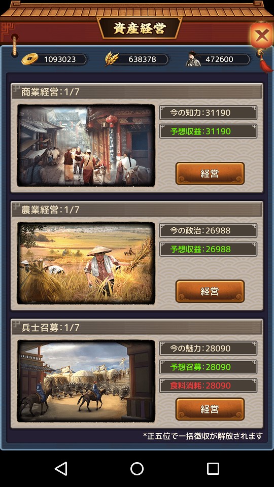 経営は銀錠(通貨)、食糧、兵士を収集するシステムで、収集量はそれぞれ門客の知力・政治・魅力の属性値の総合で決定されます。門客の属性値が高ければ高いほど、収集できる量も多くなるわけです。主に銀錠は門客の昇級、食糧は兵士の招集、兵士は敵との戦いで使うもので、どれも必須の資源ですから門客はしっかり昇級させておきましょう。