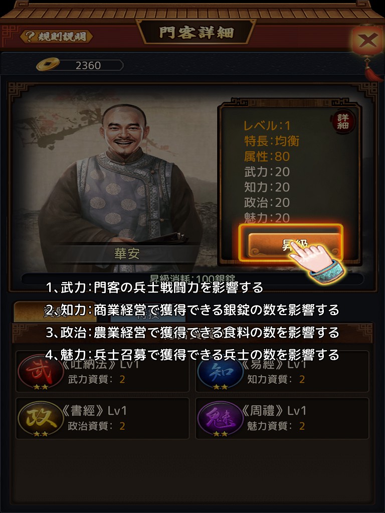 属性値はゲームの攻略に影響してきます。1人の門客だけでは頭打ちになり効率の面で悪いため、複数育てましょう。