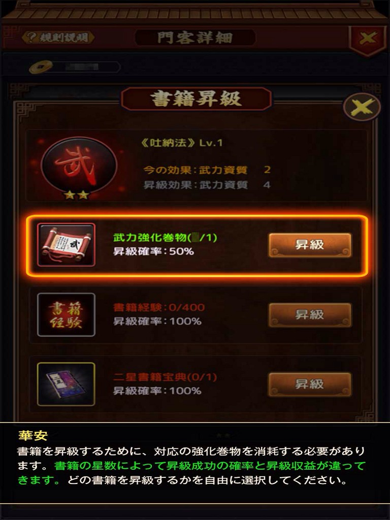 門客には属性別の資質が複数個設定されていて、属性の資質が多いほど、昇級のときの上がり幅も多いです。資質は巻物、書籍経験、宝典で伸ばすことができます。巻物の入手機会は多いですが確率なので必ず上昇するとは限りません。書籍経験は100%ですが、アイテムや書院でコツコツ経験をためる必要があります。宝典はレアアイテムです。